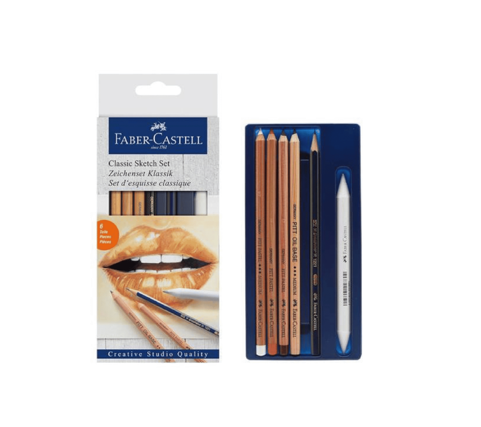 Ce set complet comprend un crayon graphite Goldfaber 2B, une estompe, un crayon PITT Oil Base et trois crayons pastels de couleurs différentes. La variété des médiums permet d’explorer diverses techniques de dessin et d’ombrage.