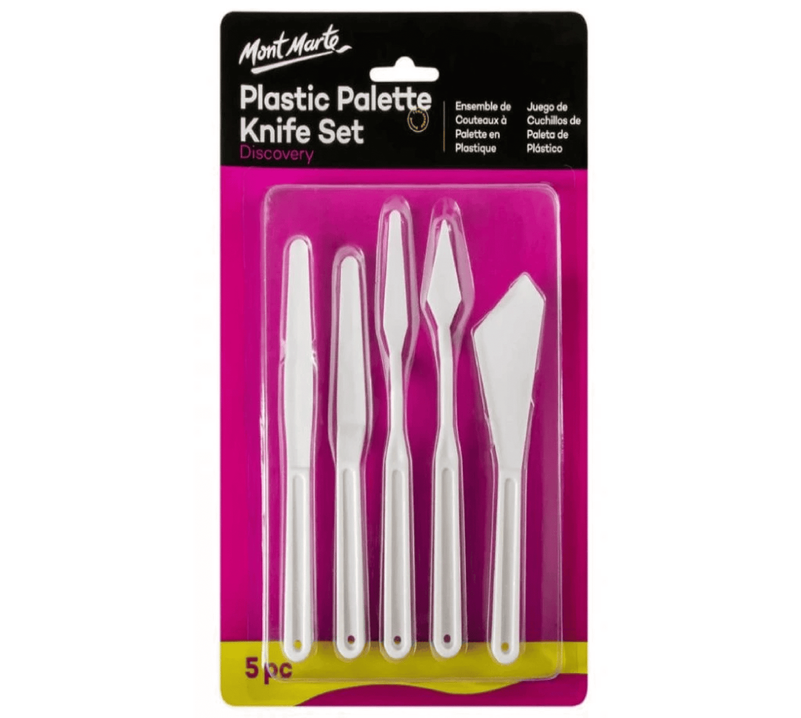 This pack of Plastic Palette Knives is an essential set of tools for any Artists’ studio. These Mont Marte Palette knives have very flexible blades that have no cutting edge, so your canvas will not get damaged when applying paint. They can be used along with brushes to apply paint to canvas, or to mix paint on the palette. Perfect for creating thick and impasto effects on the canvas, and suitable for use with oil and acrylic paint.