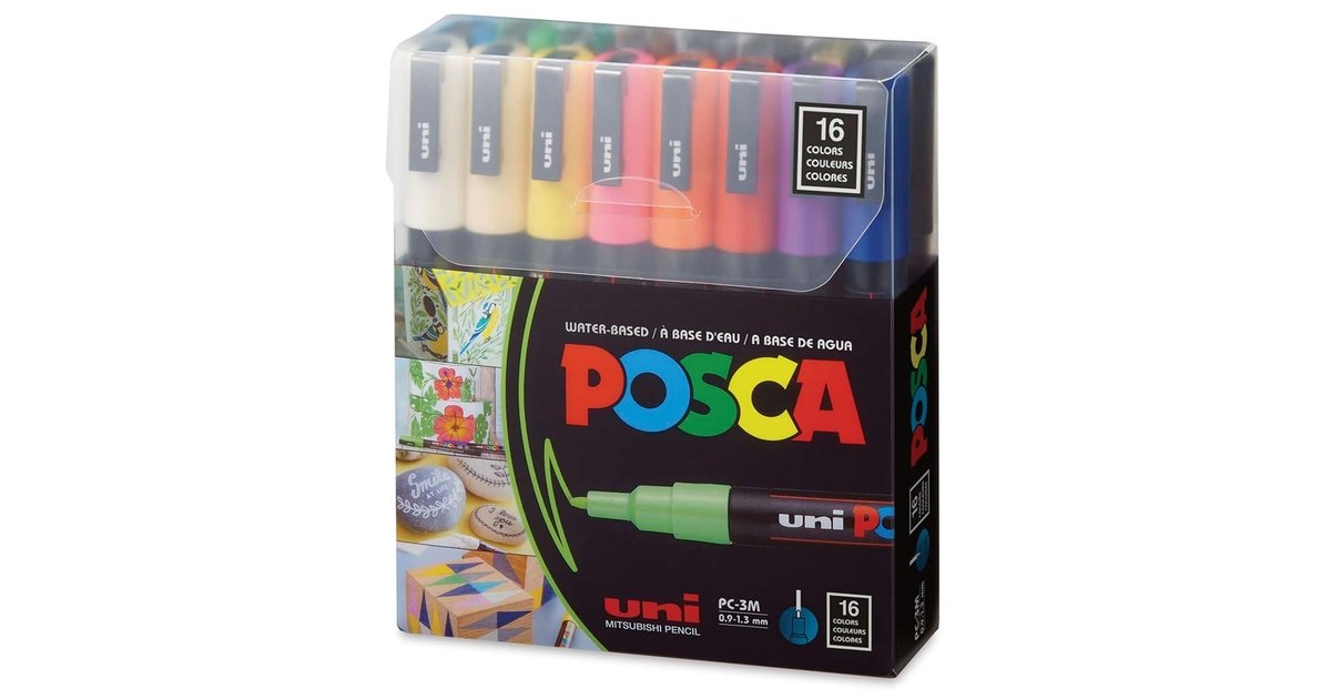 POSCA Acrylic Paint Marker Set 16 – Non-toxic, water-based POSCA markers can be used on almost any surface so you can express your creativity freely. The alcohol- and solvent-free opaque paint covers well, is blendable, dries quickly and can be overlaid when dry. The pen has a valve mechanism for a tight paint seal and a ball inside the barrel that mixes the paint, allowing for even paint consistency, texture and continued optimal results. The pen tips can be rinsed with water. The cap ensures protection and longevity of the pen tip. There is no need for a base; these versatile markers can be used on paper, glass, metal, wood, and more.