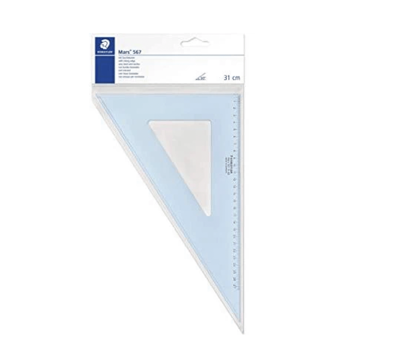 60/30 Degree | Size:31 cm Tracing edge. Scaling directly from the edge. 45° / 45°, hypotenuse length: 32 cm. Colour: blue transparent.
